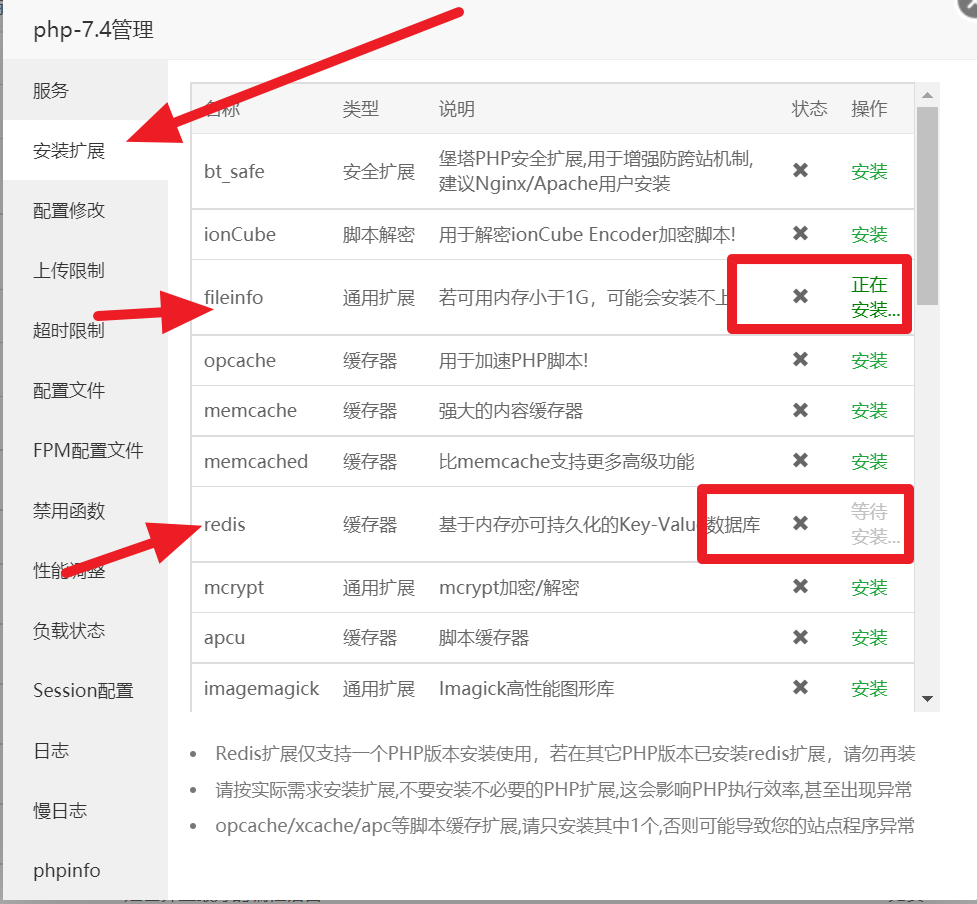 顺便,安装两个拓展fileinfo和redis,否则后面某些步骤可能会报错而无法进行。
