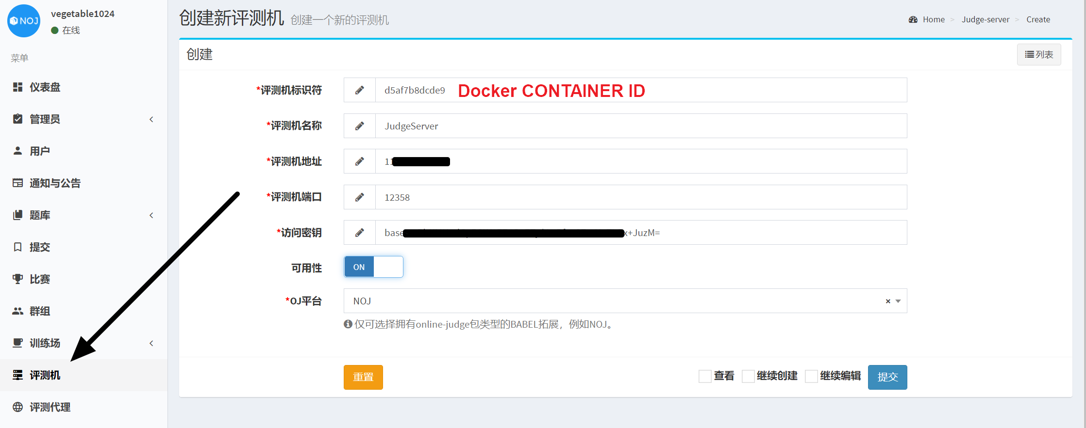 到此,Docker的配置就告一段落,回后台配置评测机: