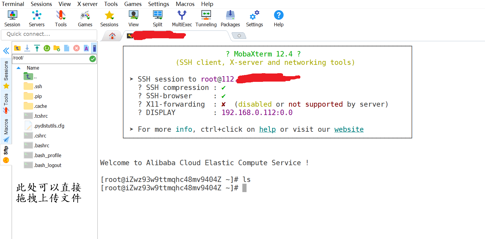 服务器建立完成后,本地建立SSH连接,以root身份登录,我使用的是MobaXterm:
