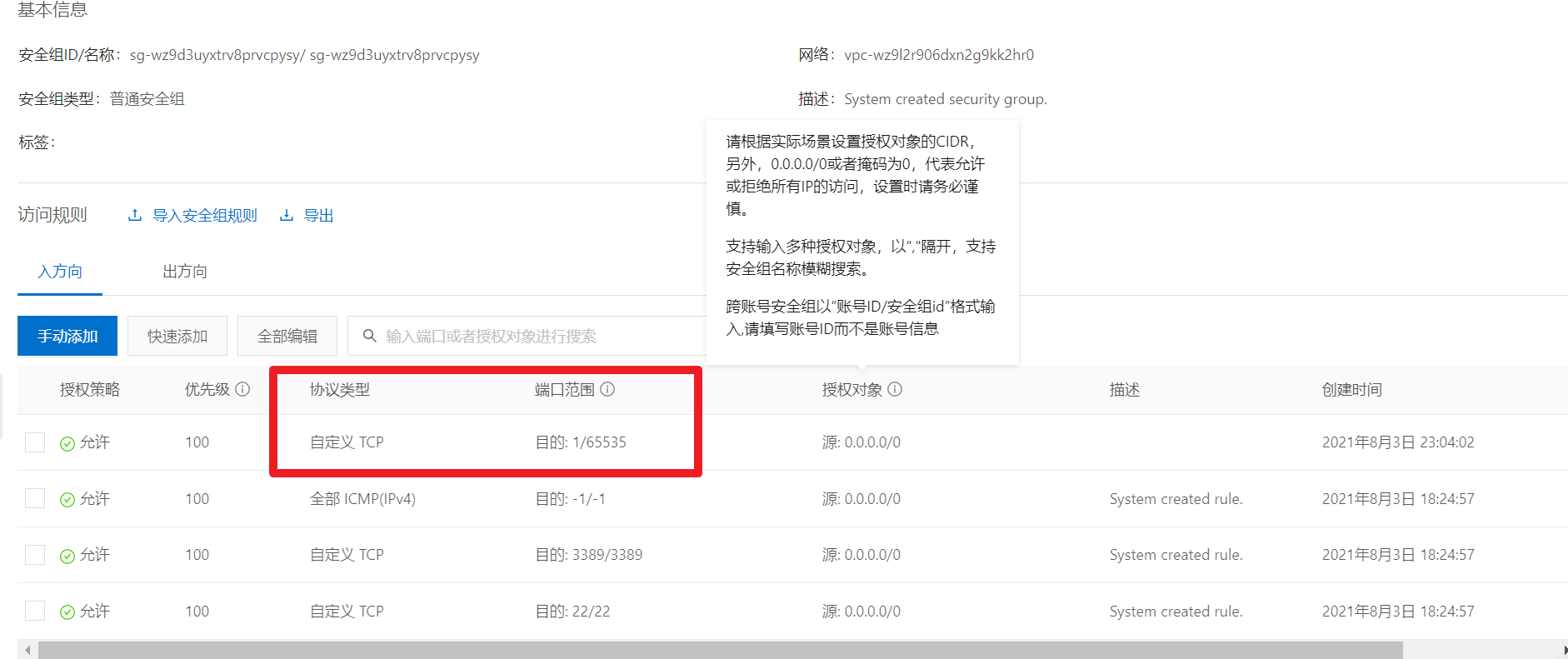 但这虽然方便但是并不安全,最好是根据后面自己定义的各个服务所需要的端口进行开放。