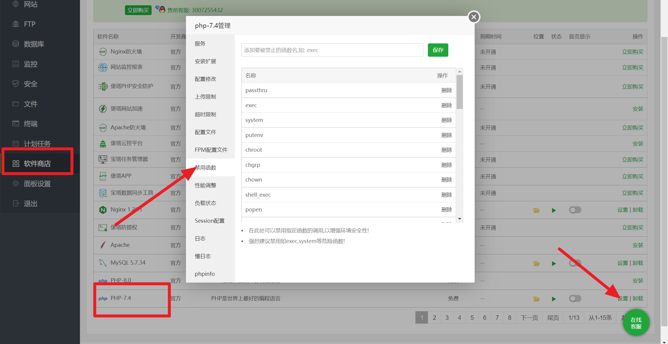 在下图所在的位置中,删除掉proc_open(),popen(),putenv():